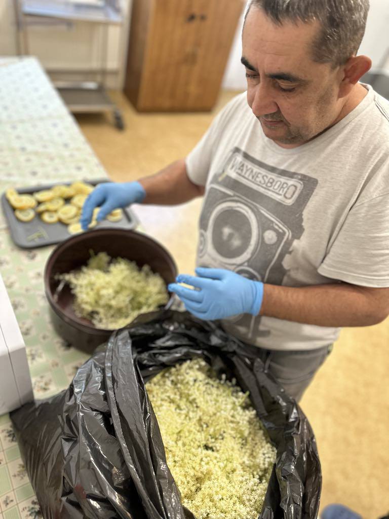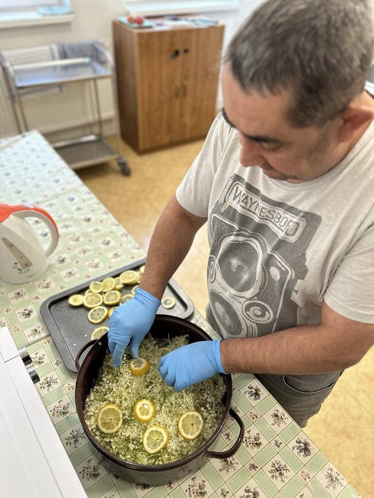 Dňa 13. mája 2025 sa v zariadení realizovala praktická pracovná aktivita s prijímateľmi sociálnej služby (PSS) – výroba bazového džemu zo surovín nazbieraných počas predchádzajúcej skupinovej činnosti. Na príprave sa aktívne podieľalo niekoľko PSS, ktorí pomáhali pri vážení surovín, miešaní a plnení hotového džemu do zaváraninových pohárov. Výsledkom spoločného úsilia bolo 13 kusov zaváranín. PSS sa nielen zapojili do samotného varenia, ale aj do kreatívnej časti aktivity – dekorovania a označovania pohárov, čím si rozvíjali jemnú motoriku, estetické cítenie a zmysel pre detail. Každý zaváraninový pohár tak získal vlastnú vizuálnu podobu, čo umocnilo pocit spolupatričnosti a úspechu z dobre vykonanej práce. Táto aktivita mala nielen praktický, ale aj terapeutický rozmer, keďže PSS mohli zažiť celý proces – od zberu surovín po hotový výrobok – čo posilnilo ich zmysel pre kontinuitu, zapojenie a výsledok vlastnej práce. Výroba džemu sa stretla s pozitívnym ohlasom a priniesla radosť všetkým zúčastneným.