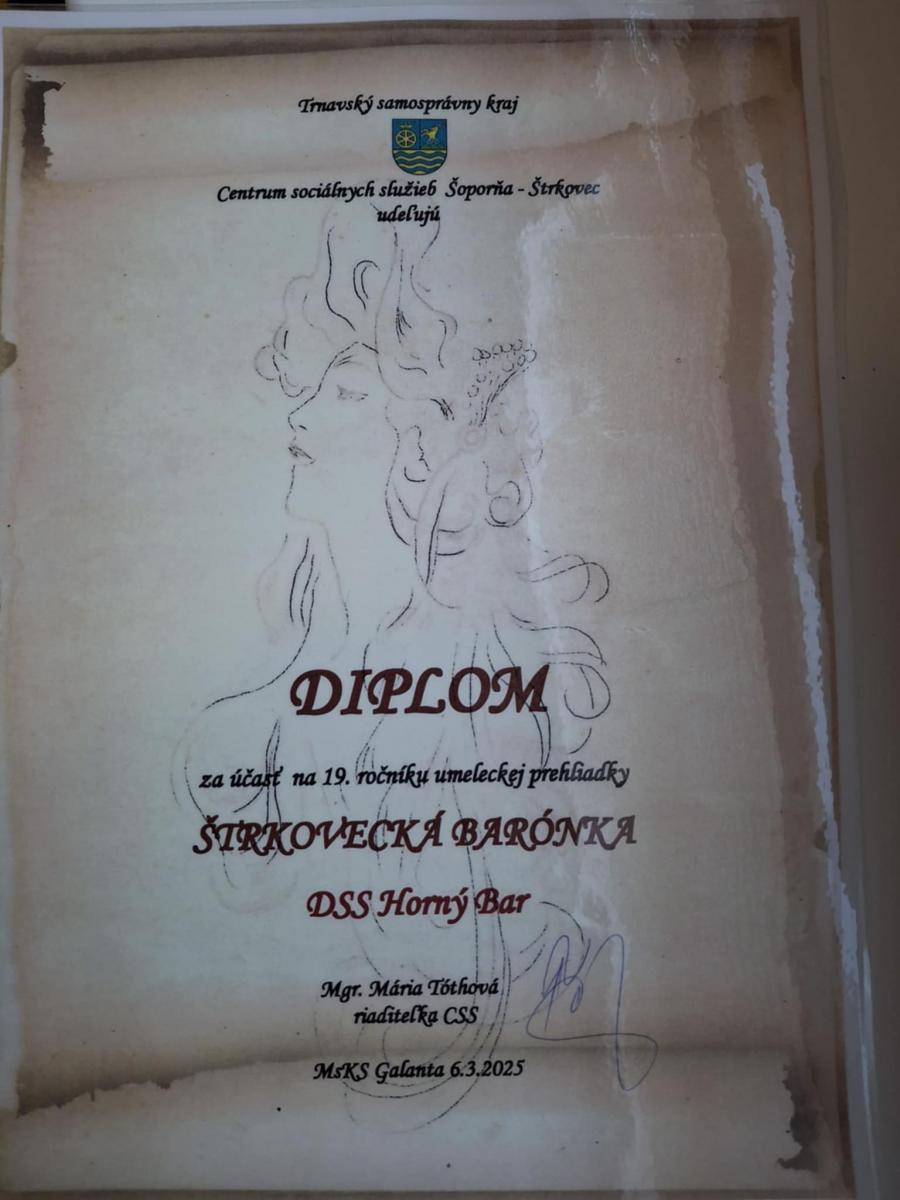 Centrum sociálnych služieb Šoporňa – Štrkovec organizovalo dňa 6. marca 2025 19. ročník Medzinárodnej prehliadky umeleckej tvorivosti klientov zariadení sociálnych služieb v zriaďovateľskej pôsobnosti Trnavského samosprávneho kraja „Štrkoveckú Barónku“ v priestoroch Mestského kultúrneho strediska v Galante. Účastníci prehliadky sa prezentovali v kategóriách tanečnej, hudobnej, výtvarnej a dramatickej. Naše zariadenie sa prezentovalo hudobným číslom. Pesnička od Karola Duchoňa „Tancujem s tebou rád“ v podaní našich klientov zožala obrovský potlesk. Putovnú sochu Štrkoveckej barónky sme síce neodniesli, ale s našim výkonom sme boli spokojní a dobre sme sa zabavili.